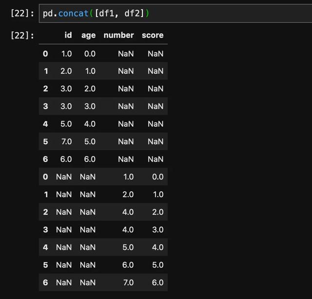 竖着拼接的时候会按照列进行对齐,如果列名对不上就会填充NaN。