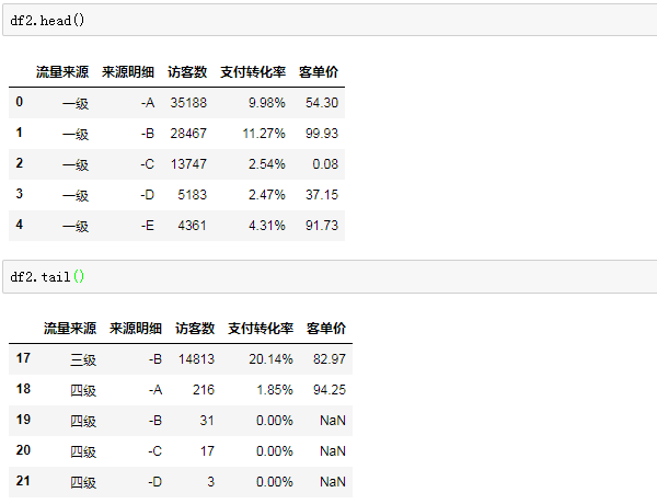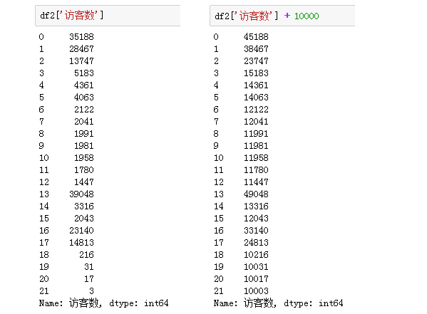 温馨提示:使用Pandas时,尽量避免用行或者EXCEL操作单元格的思维来处理数据,要逐渐养成一种列向思维,每一列是同宗同源,处理起来是嗖嗖的快。增加一列,用df['新列名'] = 新列值的形式,在原数据基础上赋值即可:我们用drop函数制定删除对应的列,axis = 1表示针对列的操作,inplace为True,则直接在源数据上进行修改,否则源数据会保持原样。选取多列呢?需要用列表来传递:df[['第一列','第二列','第三列'..]]好事多磨,复杂的针对特定条件和行列的筛选、修改,放在后面结合案例细讲,这里只讲一下最简单的更改:df['旧列名'] = 某个值或者某列值,就完成了对原列数值的修改。字符串类型是最常用的格式之一了,Pandas中字符串的操作和原生字符串操作几乎一毛一样,唯一不同的是需要在操作前加上".str"。小Z温馨提示:我们最初用df2.info()查看数据类型时,非数值型的列都返回的是object格式,和str类型深层机制上的区别就不展开了,在常规实际应用中,我们可以先理解为object对应的就是str格式,int64对应的就是int格式,float64对应的就是float格式即可。在案例数据中,我们发现来源明细那一列,可能是系统导出的历史遗留问题,每一个字符串前面都有一个“-”符号,又丑又无用,所以把他给拿掉:数值型数据,常见的操作是计算,分为与单个值的运算,长度相等列的运算。以案例数据为例,源数据访客数我们是知道的,现在想把所有渠道的访客都加上10000,怎么操作呢?