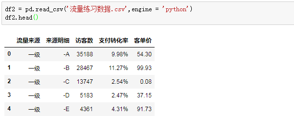 只需要选中访客数所在列,然后加上10000即可,pandas自动将10000和每一行数值相加,针对单个值的其他运算(减乘除)也是如此。列之间的运算语句也非常简洁。源数据是包含了访客数、转化率和客单价,而实际工作中我们对每个渠道贡献的销售额更感兴趣。(销售额 = 访客数 X 转化率 X 客单价)对应操作语句:df['销售额'] = df['访客数'] * df['转化率'] * df['客单价']导致报错的原因,是数值型数据和非数值型数据相互计算导致的。PANDAS把带“%”符号的转化率识别成字符串类型,我们需要先拿掉百分号,再将这一列转化为浮点型数据: