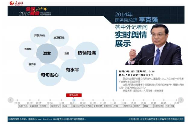 我需要说在李克强答中外记者问的时候,我想做一个实时的展示舆情,在微博上抓来数据,把这些数据分词,让这些分词抓到主旨模型。同时这个舆情就是你看到的实时舆情,这是推特的舆情,不光能看到,还能感知到数据实时的波动。所以我们经常说,到了今天,特别是大数据的时代,我们不再追求说它的统计什么样,二是更关注我看得见,我感知到这个社会脉络。