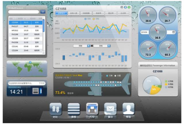实际上这是曾经机场上搞不清楚航班延误怎么样,其实都有,但是它没法儿分散,所以做了一个所谓的动态显示屏。这个显示屏我们可以看到不同的汽车,包括预警,这些如果你归纳起来,它是早期的可视化,或者叫前端展示。我们叫商业智能。