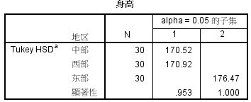 将没有显著性的水平进行子集检验,可以得到中部和西部学生身高之间没有显著性差异,但是与东部学生身高有显著性差异。